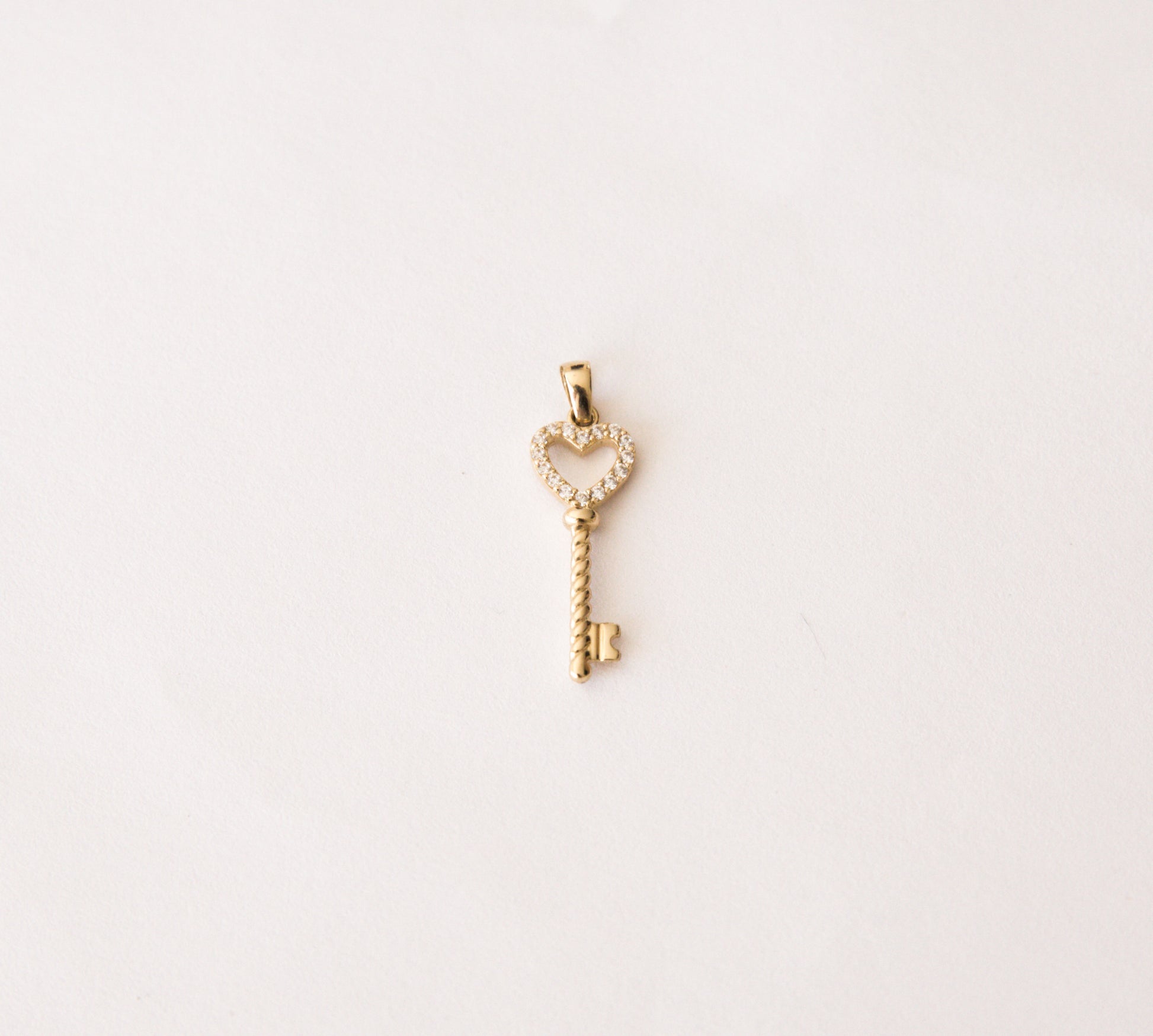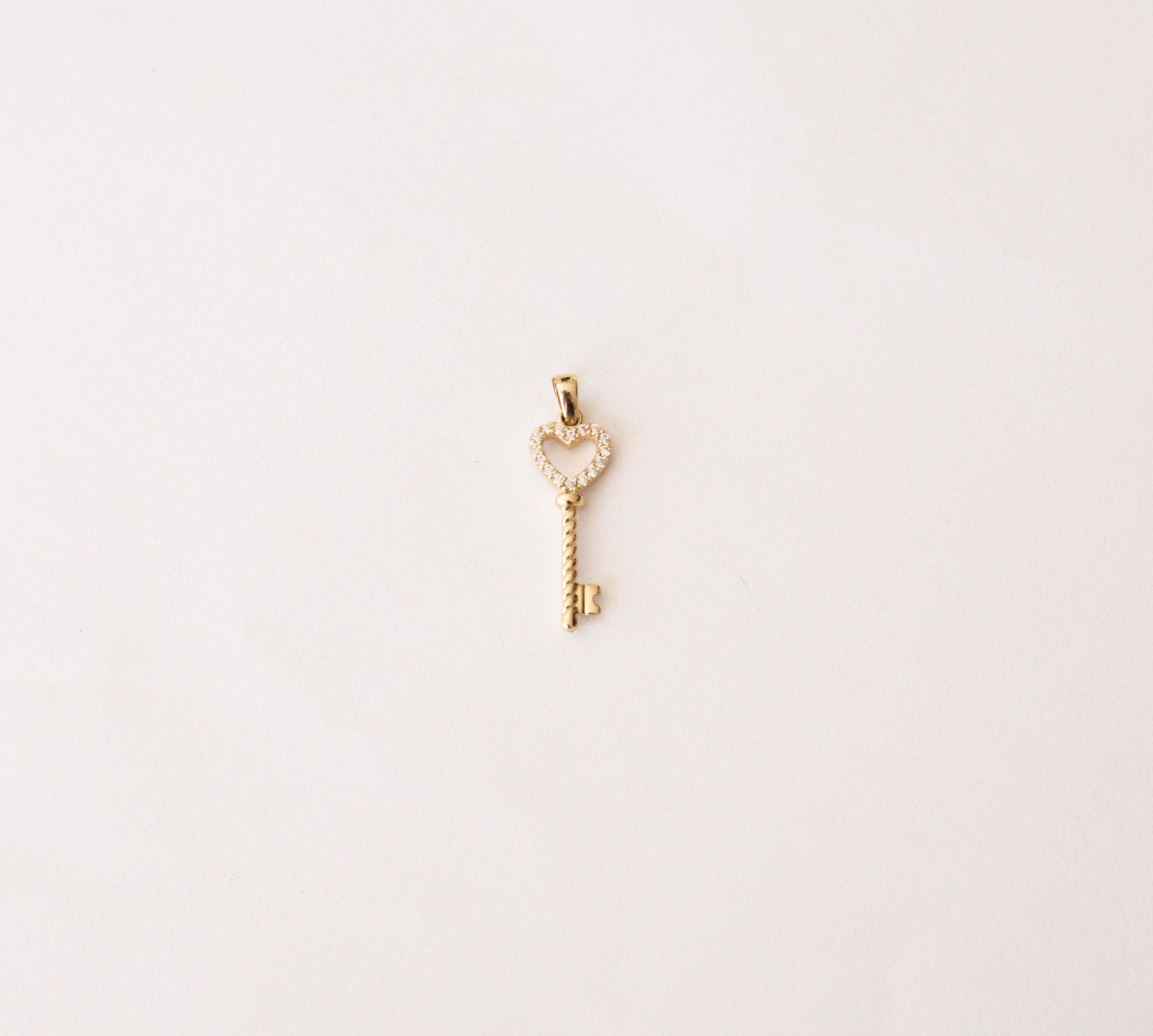 Dije de llave en forma de llave con corazón rodeado de zirconias pequeñas, listo para utilizar y verte increíble!